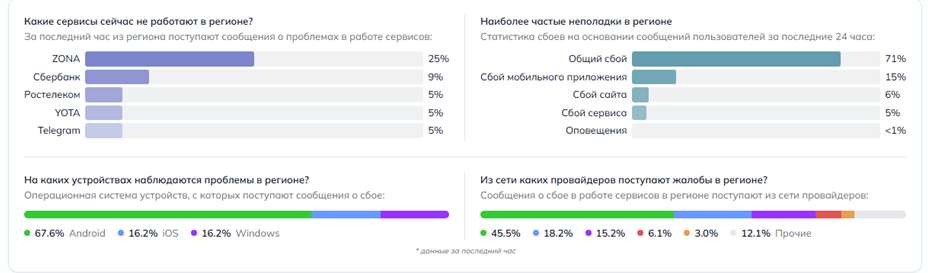 Судя по статистике, общий сбой составляет 72%, сбой мобильных приложений — 15%. Больше всего проблемы с подключением к Сети испытывают пользователи Android — 67,6%, после с 16,2% идут пользователи iOS и Windows.