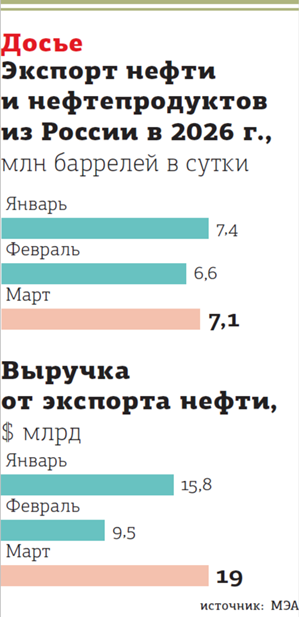 Экспорт нефти рос на фоне роста цен. Средняя цена нефти Urals в марте 2026 года выросла на 80% относительно февраля, до $73,8 за баррель. В апреле рост продолжится, прогнозирует директор по внешним коммуникациям NEFT Research Дмитрий Прокофьев. Уже во второй половине апреля цены на нефть могут достичь как минимум $150 за баррель, считает спецпредставитель президента РФ по инвестиционно–экономическому сотрудничеству с зарубежными странами Кирилл Дмитриев.