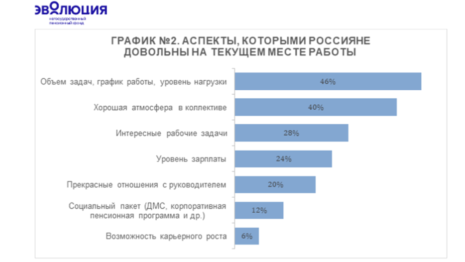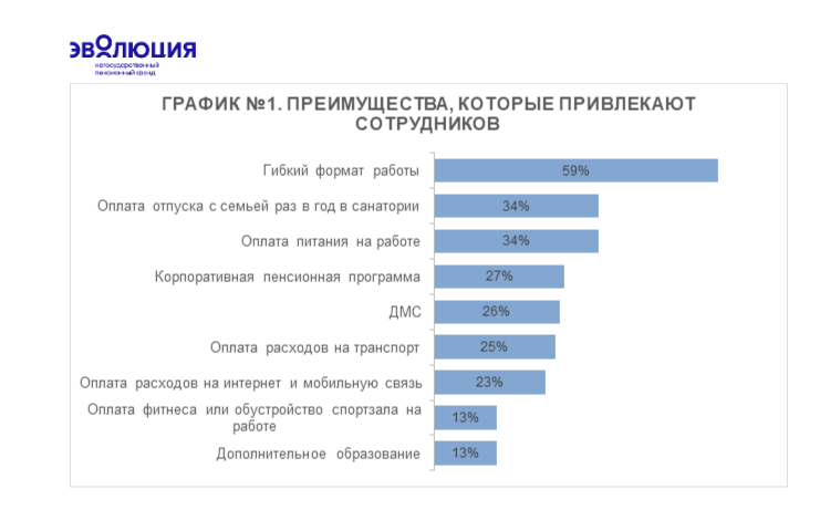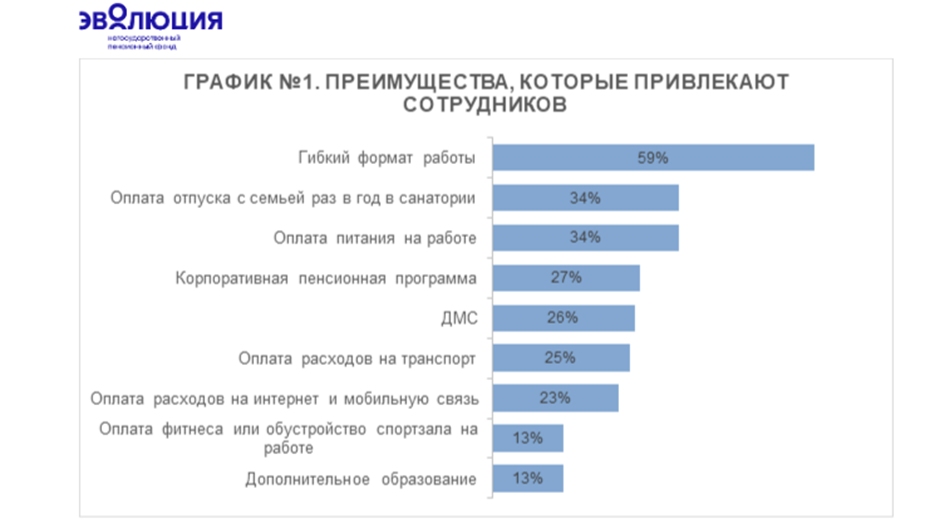 "Всего 12% участников нашего опроса довольны своим соцпакетом на работе. А между тем социальные льготы являются важным стимулирующим и мотивирующим элементом. Расширить соцпакет и сделать его более привлекательным как для сотрудников, так и для потенциальных кандидатов позволят долгосрочные финансовые инструменты. Среди них — корпоративная пенсионная программа. КПП работает в обе стороны: для сотрудника это возможность увеличить будущую пенсию за счет поддержки работодателя, а для компании — эффективный инструмент повышения мотивации и лояльности персонала", — рассказала генеральный директор НПФ Эволюция Елена Тетюнина.