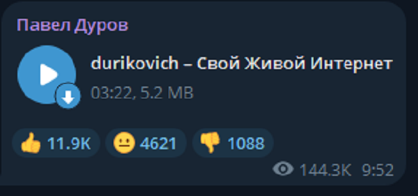 Основатель Telegram Павел Дуров разместил в своём канале трек в жанре шансон о борьбе с блокировками в Сети. Пост в мессенджере опубликован 23 апреля.