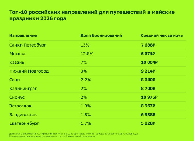 "Список самых популярных направлений по бронированиям проживания на майские праздники традиционно возглавляют Санкт-Петербург, Москва и Казань. В десятку лидеров также входят Нижний Новгород, Сочи, Калининград, Сириус, Эстосадок (Адлерский район, Сочи), Владивосток и Екатеринбург", — отметили аналитики.