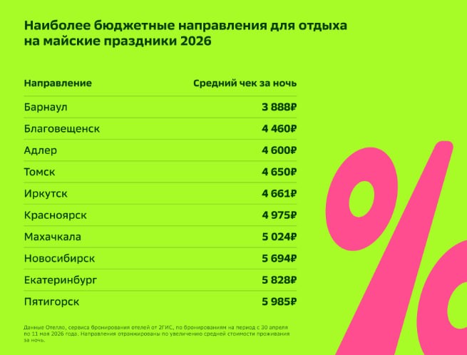 "Дешевле всего в России обойдётся проживание в Барнауле, Благовещенске, Адлере, Томске, Иркутске и Красноярске — в этих городах средняя стоимость одной ночи в отеле не превышает 5000 рублей. Также в список довольно бюджетных направлений для отдыха в майские праздники входят Махачкала, Новосибирск, Екатеринбург и Пятигорск — здесь средняя стоимость ночи не превышает 6000 рублей", — поделились авторы исследования.