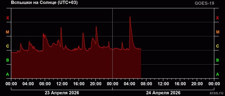Утром 24 апреля на Солнце была зафиксирована вспышка уровня X2.5, сообщили в пресс-службе лаборатории солнечной астрономии ИКИ РАН.