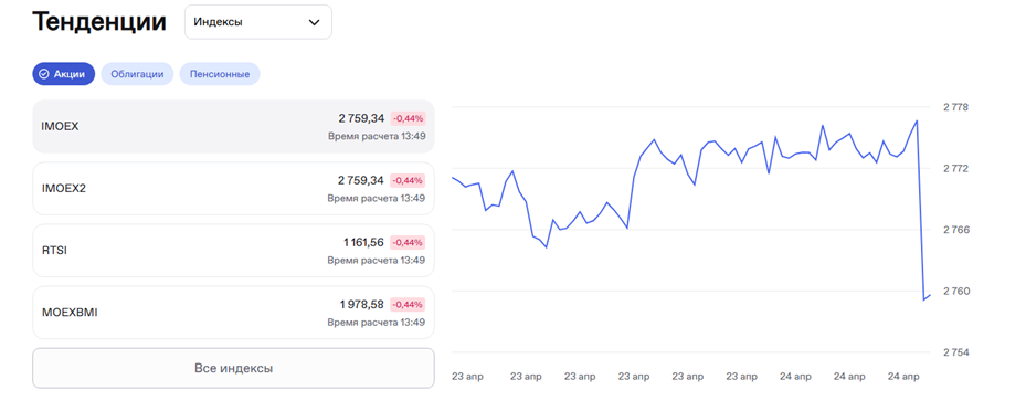 После снижения ключевой ставки до 14,5% индекс Мосбиржи 24 апреля в первые минуты упал вниз и достиг на минимуме 2761,41 пункта. К 13:38 по мск индекс был на уровне 2756,75 пункта.