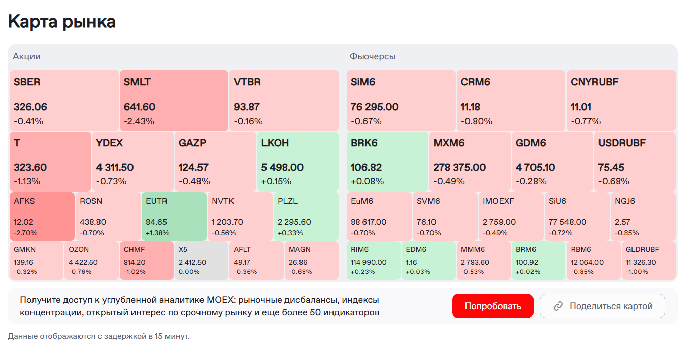 Большинство акций показали падение. Так, акции Сбера снизились на 0,37%, "Роснефти" на 0,54%, "Яндекса" на 0,82%, "Газпрома" на 0,45%.