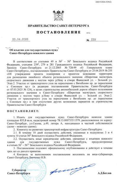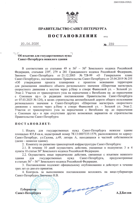 "Изъять для государственных нужд Санкт-Петербурга нежилое здание площадью 835,8 м2, кадастровый номер 78:13:0007335:1579, расположенное по адресу: Санкт-Петербург, улица Салова, д. 49, литера А, находящееся в частной собственности", — гласит постановление.