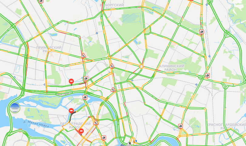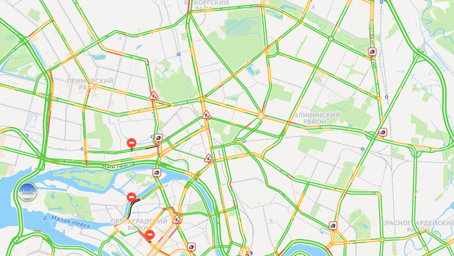 Судя по данным сервиса "Яндекс Пробки", несколько аварий тормозит движение у станций метро "Новая деревня" и "Чёрная речка", на улице Руставели, Шафировском проспекте.