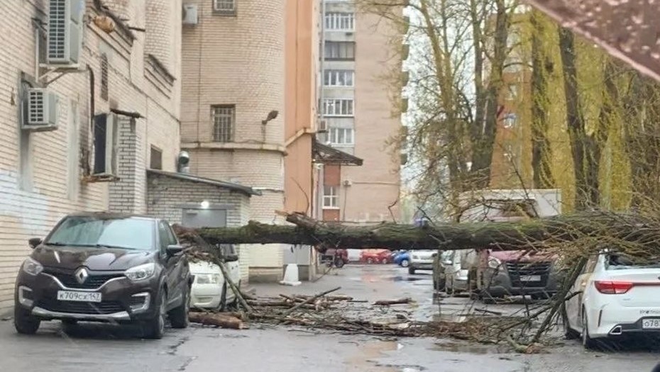 В Петербурге на Ленинском проспекте на один из автомобилей, припаркованных во дворе дома, упало дерево, сообщают очевидцы.