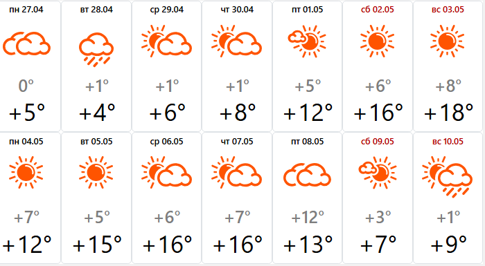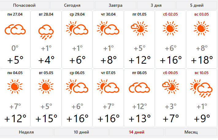 Судя по прогнозу от "Фобос", потепление в городе начнётся с 30 апреля. В этот день столбики термометра поднимутся до +8 градусов тепла. После температура воздуха будет плавно подниматься и к майским выходным достигнет +18 градусов.