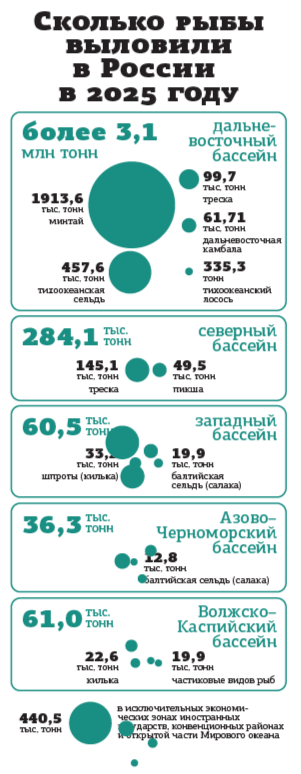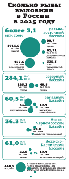 По итогам 2025 года улов водных биоресурсов по всем районам промысла составил 31,16 тыс. тонн. Объём производства продукции глубокой переработки рыбы и морепродуктов — 36,5 тыс. тонн.