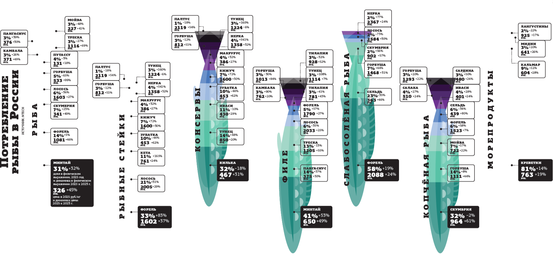 Охлаждённая рыба также присутствует, но длинное транспортное плечо заметно сокращает её долю.