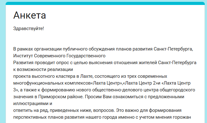 "В рамках организации публичного обсуждения планов развития Санкт-Петербурга, Институт современного государственного развития проводит опрос с целью выяснения отношения жителей Санкт-Петербурга к возможности реализации проекта высотного кластера в Лахте, состоящего из трех современных многофункциональных комплексов: "Лахта Центр","Лахта Центр 2" и "Лахта Центр 3", а также к формированию нового общественно-делового центра общегородского значения в Приморском районе", — следует из опроса.