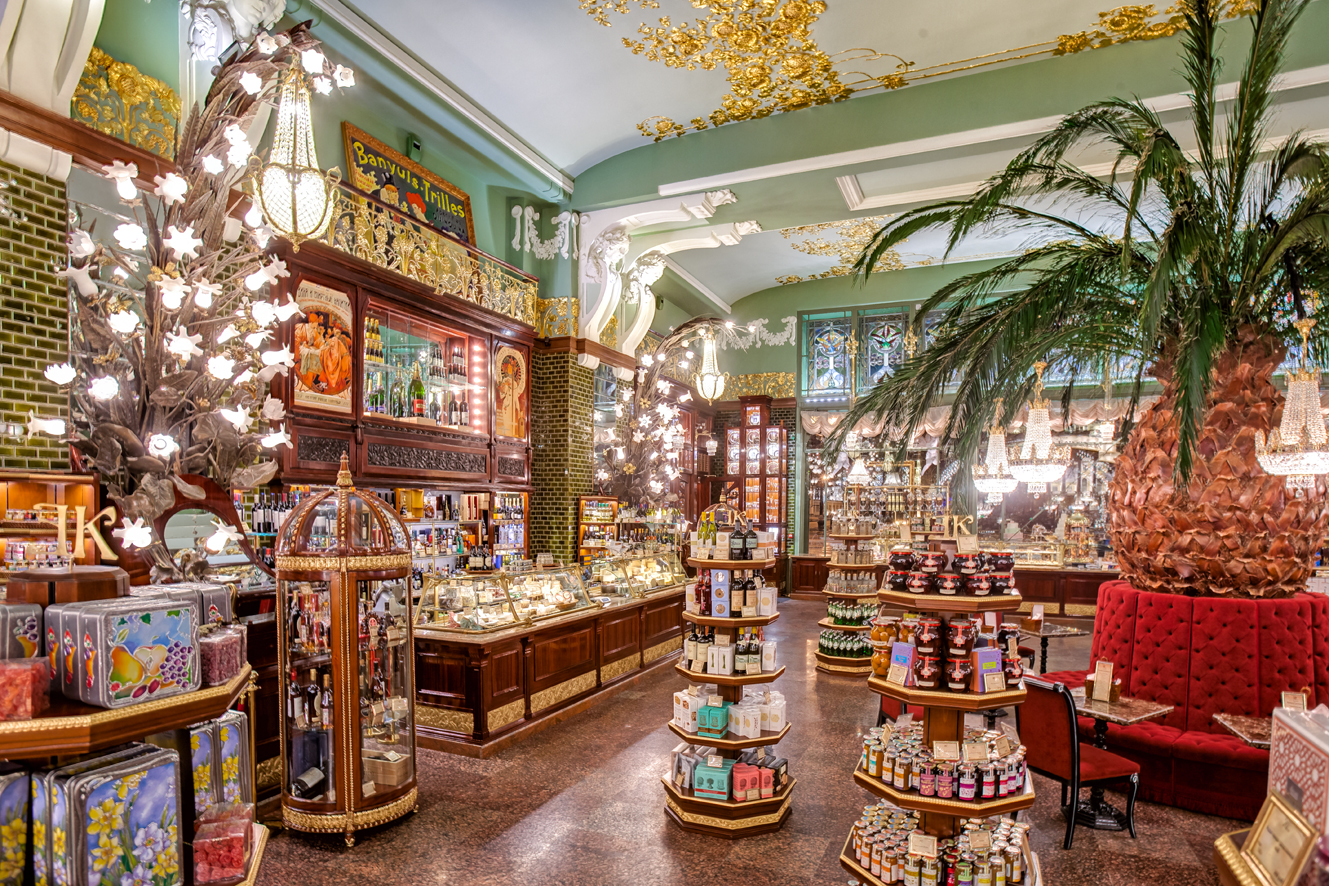 Кроме того, в стилистическом оформлении магазина — в художественных композициях витрин — соседствуют старинные бутылки (реплики или подлинники), этикетки, упаковочные материалы XIX века и современные аналоги, чтобы показать преемственность и уже "современность". Сделать акцент на сочетании традиций и новых тенденций позволяет и обновление ассортимента: наряду с историческими позициями здесь предлагаются те, что отвечают вкусам сегодняшнего потребителя. Так, например, в 2025 году компания заключила договор о поставках с винодельческим хозяйством из Бордо — и для магазина это событие как раз "исторического характера": Франция имела особое значение для торговой деятельности купцов Елисеевых.
