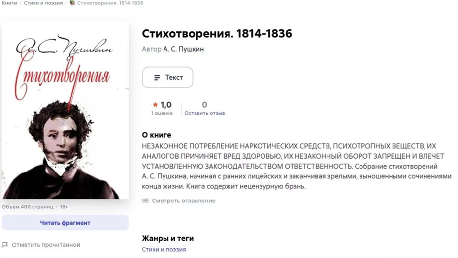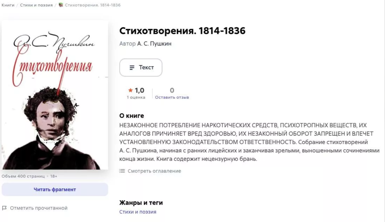 28 апреля в "Литрес" сообщили, что маркировка текстов Александра Пушкина, Николая Гоголя и Алексея Толстого была некорректной. Предупреждающие знаки убраны с карточек произведений, сообщил ТАСС со ссылкой на представителя сервиса.