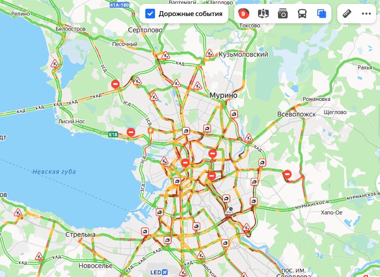 Самая сложная обстановка к 17:00 по мск сложилась на внутреннем кольце КАД в районе Кудрово Ленинградской области. Пробка здесь растянулась на 10 км. Кольцо стоит от Колтушского шоссе до виадука над железной дорогой. На трассе фиксируют сразу около 10 аварий.