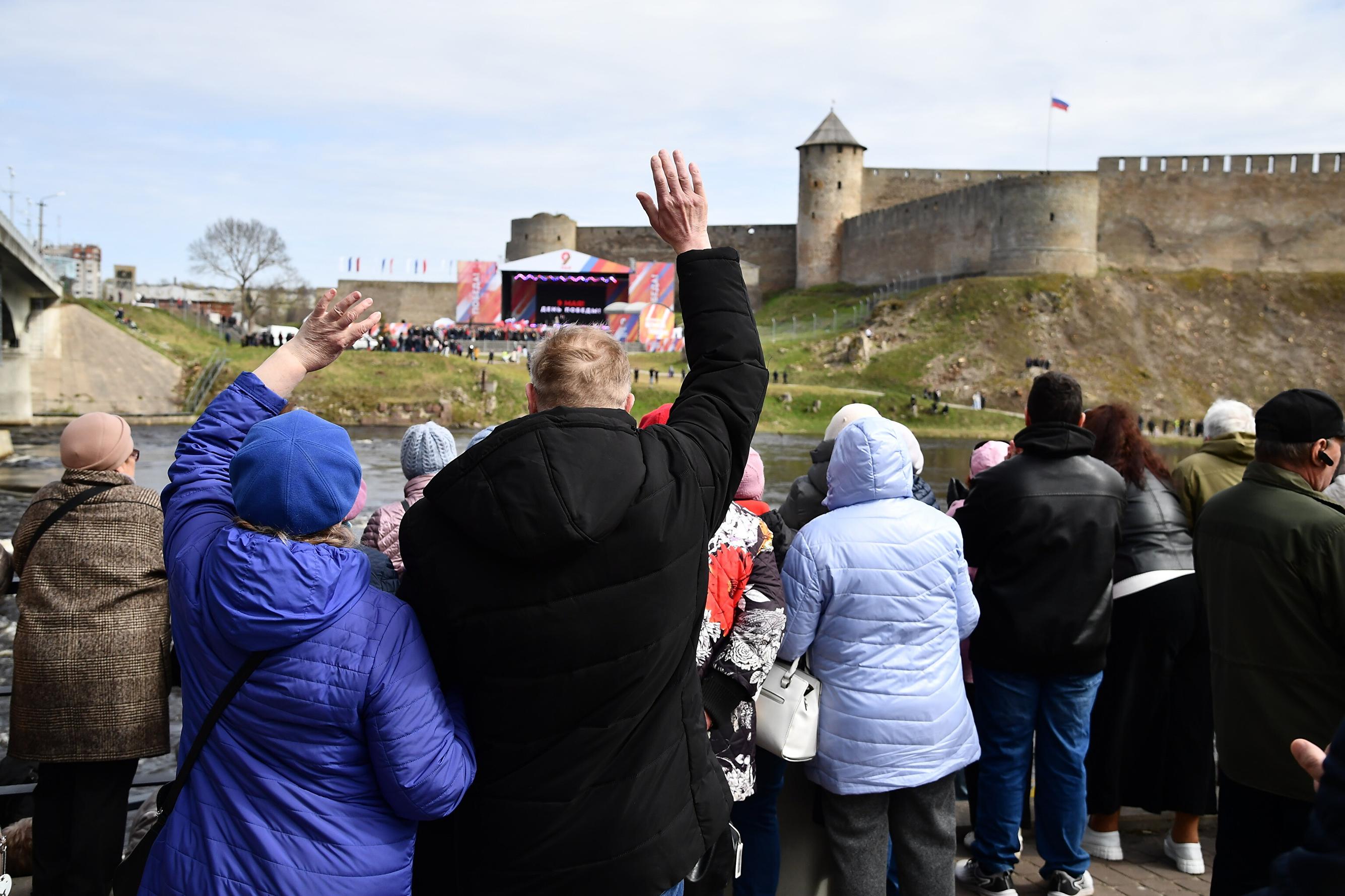 В российском Ивангороде в честь Дня Победы устраивают большой концерт: на набережной реки Нарвы устанавливают сцену, а мероприятие с больших экранов транслируют в сторону Эстонии.